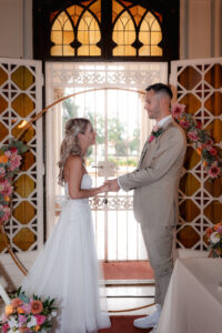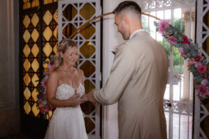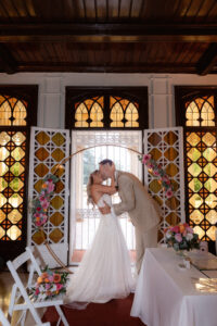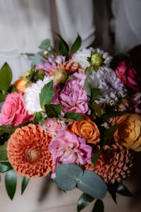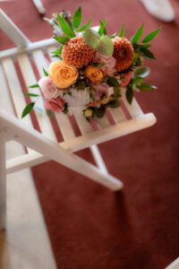 A polgári szertartás egy világos, nagy belmagasságú teremben zajlott. Az arany körívre épített virágkompozíció több ponton is visszaköszönt a térben, így egységes vizuális hatást teremtett. Barack, rózsaszín és narancs árnyalatú virágokat használtunk, sok zöld kiegészítéssel. A díszítés arányos volt, és jól érvényesült a fotókon.